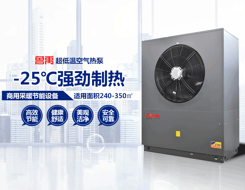 魯禹家用空氣源熱泵供暖機(jī)組由壓縮機(jī)、冷凝器、膨脹閥、蒸發(fā)器等部件組成。在室外熱能轉(zhuǎn)移過程中,每消耗1份電能,就可以為室內(nèi)提供4份的熱量(根據(jù)不同運(yùn)行狀態(tài),該值也會(huì)有所不同)。