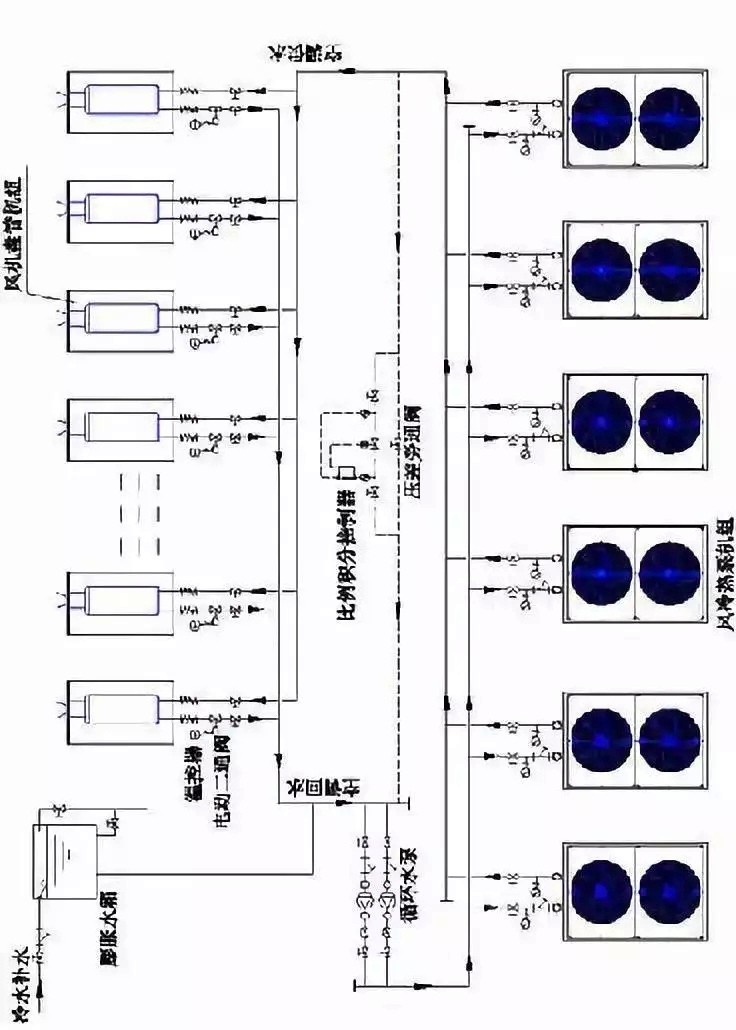空調水系統為一次泵變流量、雙管制系統,系統干管采用異程式。每層水系統的回水干管上設置平衡閥。每臺風機盤管機組的回水管上設計電動二通閥。風機盤管的供水量控制由室內溫控器按所需的室溫來控制?照{冷熱水系統定壓補水裝置采用高位的膨脹水箱。